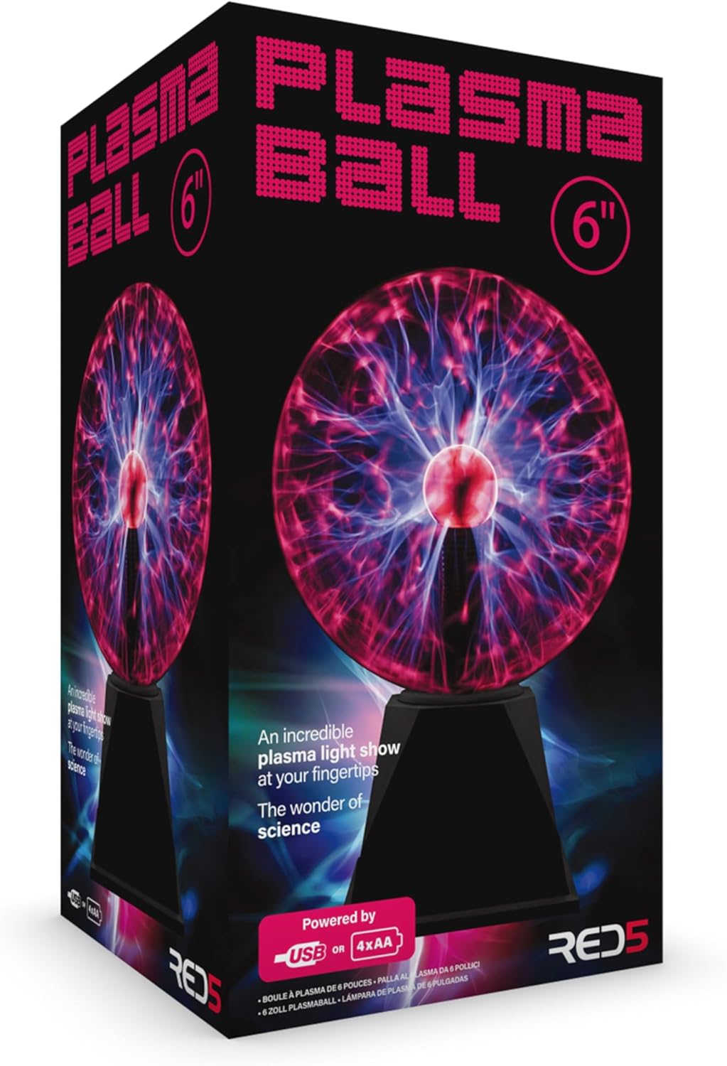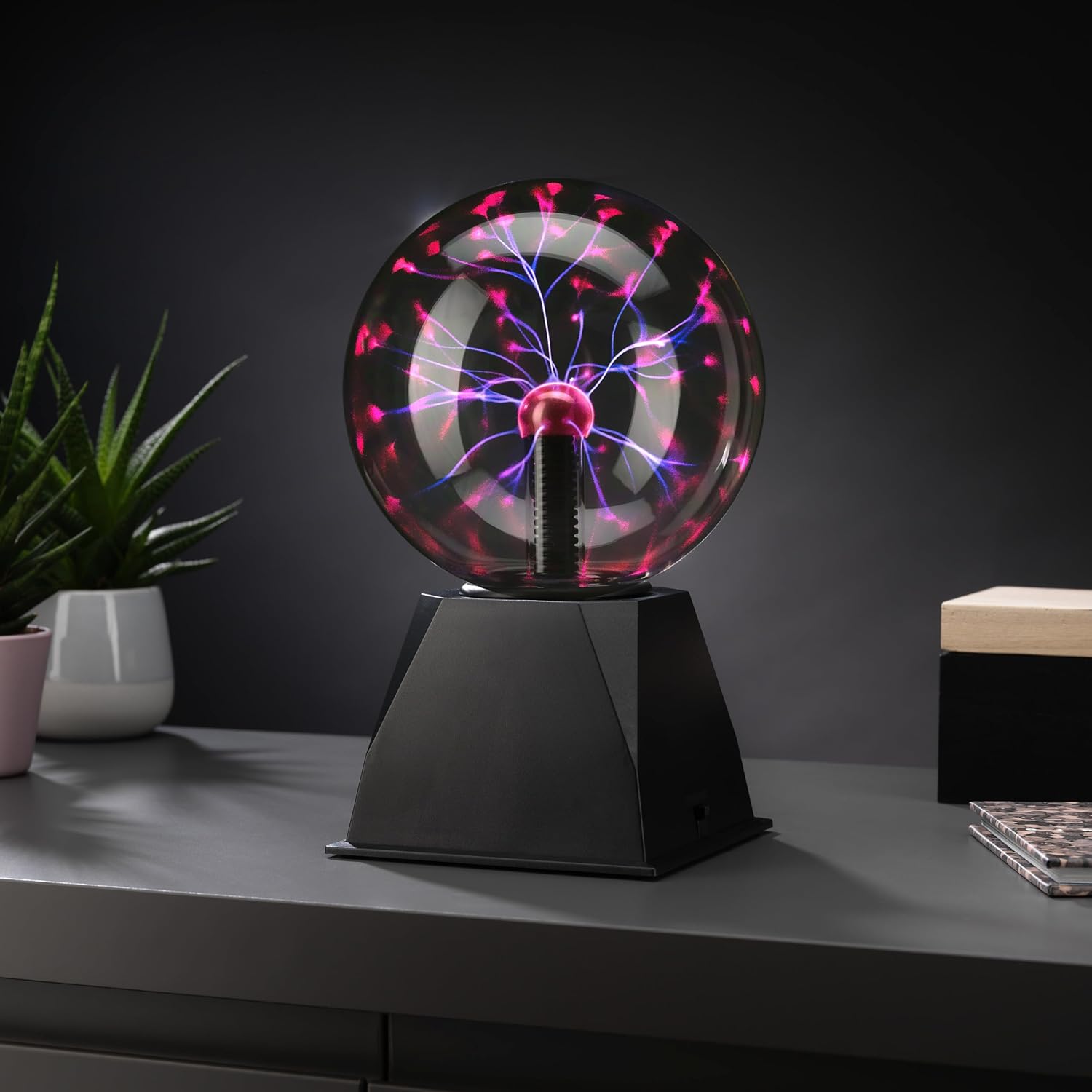 - Battery or USB Powered Switch Controlled Inert Gas Plasma Ball with 6" Glass Globe and ABS Plastic Base