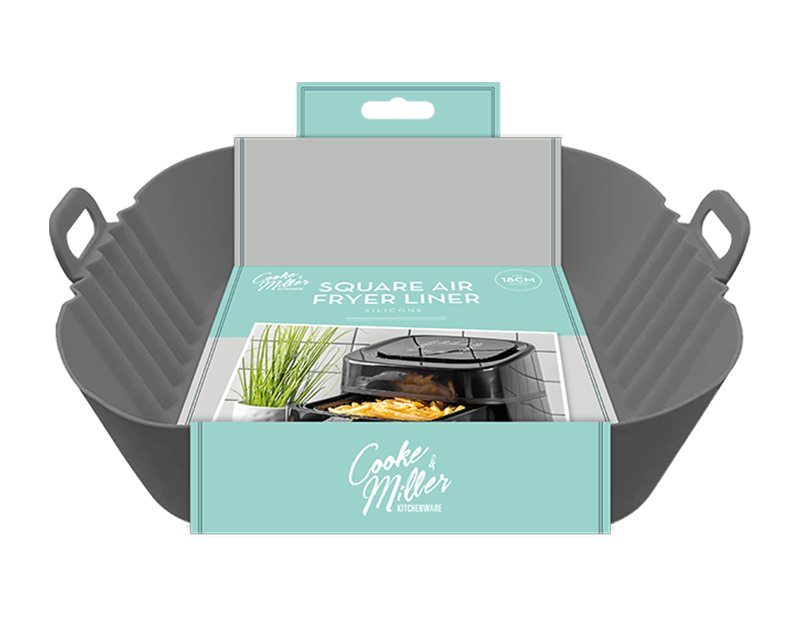 This square silicone air fryer liner has an approximate size of 18 x 18cm and will easily fit into most types of air fryer. Each liner features a textured bottom and two handles, and is also suitable for dishwasher and microwave.