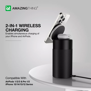 Streamline your charging setup with simultaneous charging for your iPhone and AirPods. Keep all your essential devices powered up and ready to go with our convenient 2-in-1 charging feature.