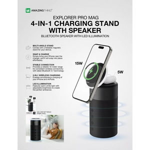 The AT Explorer Pro Mag 4-in-1 Charging Stand with Speaker is the ultimate charging solution for your devices. Engineered with cutting-edge features and premium craftsmanship, this stand simplifies your life while enhancing your charging experience.