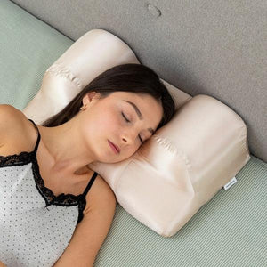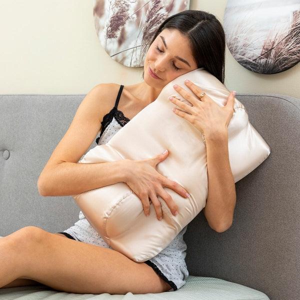 An ergonomic anti-frizz pillow for sleeping in 3 positions that reduce contact with the face and alleviate facial pressure. Cover with zip so it can be removed and washed.