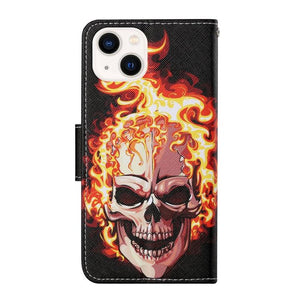 Apple iPhone 15 3D Colored Drawing Flip Leather Phone Case Cover (Flame Skull)