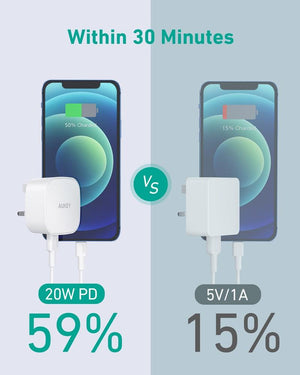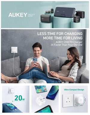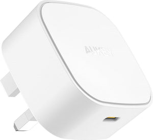 Aukey 20W Charger Type C Power Delivery 3-Pin UK Charging Plug White for iPhone 13 Mini, 13, 13 Pro, 13 Pro Max, iPhone 12 Mini, 12, 12 Pro, 12 Pro Max, iPad Pro