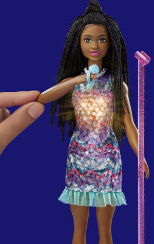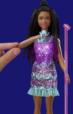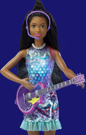 Imaginations can relive an epic onstage moment with Barbie "Brooklyn" Roberts doll in her signature performance look from Barbie: Big City, Big Dreams! Ready for the spotlight? When kids lift Barbie doll's microphone to her mouth, music will play, her dress will light up, and she'll sing along to one of two original songs! When her arm is rested back in place, the music will keep playing but Barbie doll will stop singing until kids lift the microphone up again.