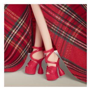 Her draping one-shoulder red gown features bright sparkles that allow her to shimmer and shine through the packaging!