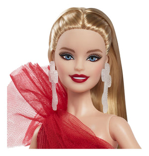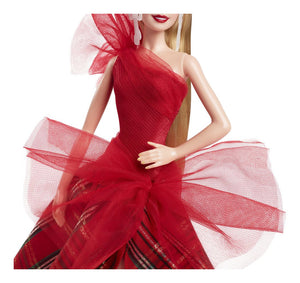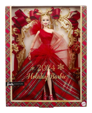 The 2024 Holiday Barbie doll embodies the warmth and love of the season with a festive gown and party look! Showcasing gorgeous drama, the dress pairs a draping, one-shoulder, sparkling red bodice with a full, plaid ballgown-style skirt. Big tulle accents are a modern take on a classic look. In packaging that's ideal for display, this collectible doll makes a great gift for 6 year olds and up. Includes doll stand and Certificate of Authenticity. Doll cannot stand alone. Colors and decorations may vary.