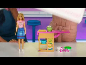 Explore a world of noodle-making fun with the Barbie Noodle Bar Playset! If you love cooking, then you can be a noodle maker! The Barbie Noodle Bar Playset includes Barbie doll wearing a professional outfit with a cute food-inspired graphic, a noodle-making workstation and accessories. To make the noodles, take the white dough from one container (the other container has green dough) and put the white dough in the hole in the middle of the workstation. Then slide the noodle bowl with lid over the hole and push the sideboard down and watch the noodles magically appear in the bowl! So fun! Now it's time to add some veggies, so take the green dough and put it in the mold on the other side of the workstation and push the top down. Open it and you have broccoli! You can trim the excess dough with the play knife, and then cut the broccoli into pieces and add it to the noodles! Barbie doll is ready to share with friends and she has an extra bowl and 2 pairs of chopsticks. Yum, these are the best noodles ever! The Barbie Noodle Bar Playset comes with Barbie doll, noodle workstation, 2 containers of dough (white and green), play knife and 2 pairs of chopsticks. Doll cannot stand alone. colours and decorations may vary. For ages 4 and up.