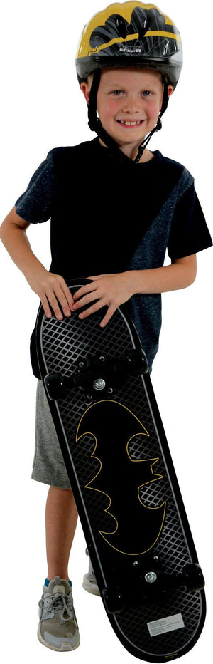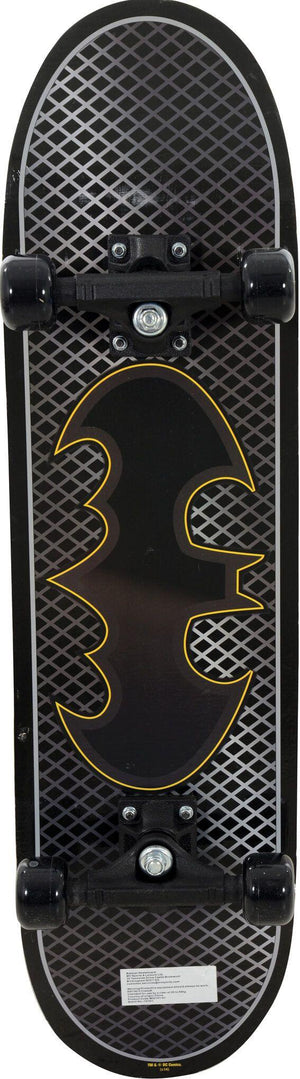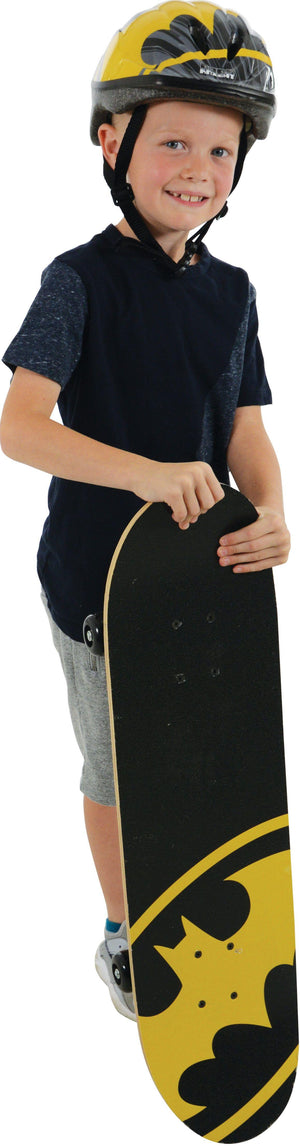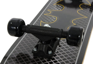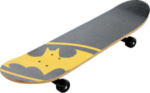 Cool Batman skateboard, 79cm x 20cm (31” x 8”). 7 ply maple deck for durability. Double kicktail deck for advanced tricks. Flat deck area allows maximum space for feet enabling “boardwalking” and other tricks. 50mm PVC wheels with 608z bearings. Plastic trucks with PVC cushions for a smoother ride. Fully printed deck and griptape. Maximum user weight 50.