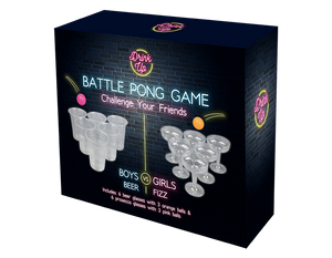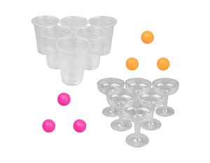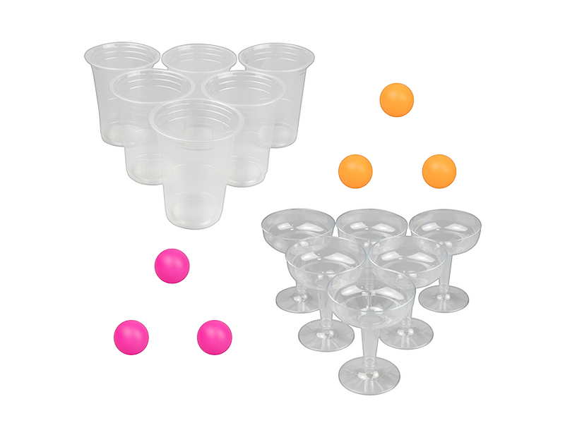 Battle of the pong! A great drinking game to challenge friends. Each game contains six beer glasses with 3 orange balls and 6 prosecco glasses with three pink balls.
