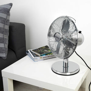 - Finished in a sleek sliver chrome, this desk cooler fan suits any environment while offering both style and high-quality performance.