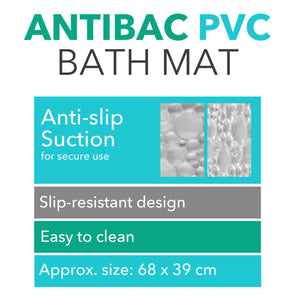 This Beldray Anti-Bac PVC Bath Mat is perfect for any bathroom in your home. The anti-slip suction underneath provides secure use to prevent slipping or falling and allows the mat to stay in place, even when wet. Crafted from durable PVC, this bath mat is easy to clean and measures approximately 68 x 39 cm to provide generous coverage. Made with an antimicrobial treatment that resists everyday staining and bacteria build up helping to keep your bath mat cleaner and fresher for longer.