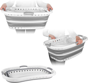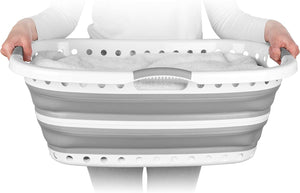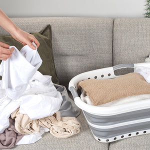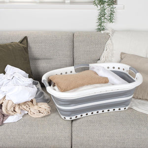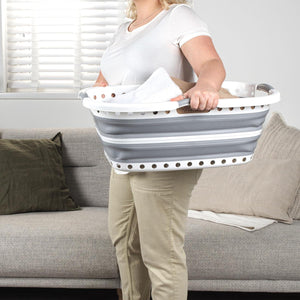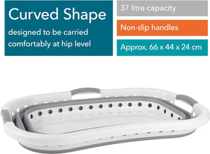 - Designed in grey and white, the collapsible laundry basket is made from very durable plastic and easily folds away for compact storage.