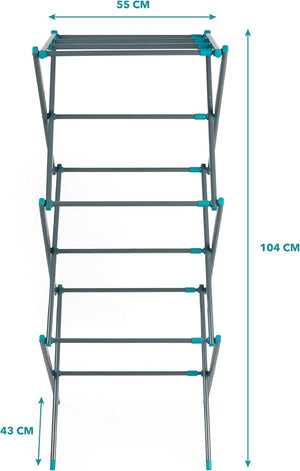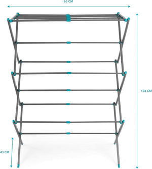 - The airer measures 72l x 43w x 104h cm when opened and has a generous amount of drying space, so you can air a large load of laundry.