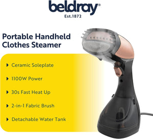 Beldray Handheld Clothes Steamer - Portable Vertical Garment Steamer, 1100W Wrinkle Remover, 180ml Detachable Water Tank, 30 Second Fast Heat Up, 2-In-1 Fabric & Lint Brush, Rose Gold