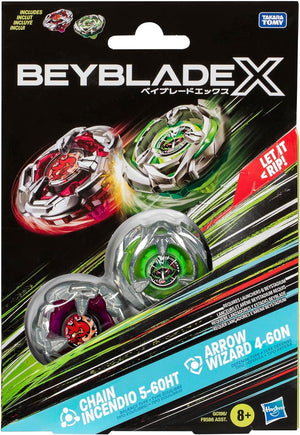 - HARNESS THE POWER: Includes 2 Takara Tomy-designed Beyblade X tops with authentic die-cast metal parts: Chain Incendio 5-60HT Right-Spin Balance Type and Arrow Wizard 4-60N Right-Spin Defense Type.