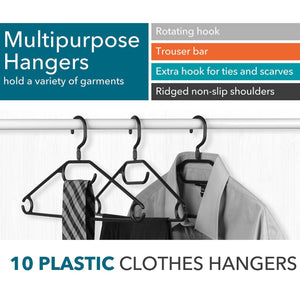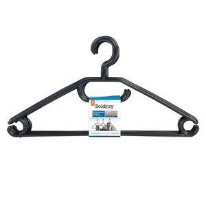 - A pack of 10, these multi-purpose plastic Beldray clothes hangers have neutral black colouring to suit any wardrobe or storage space.