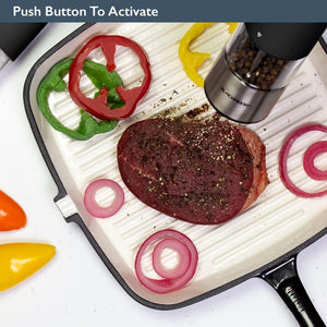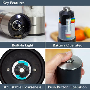 - AUTOMATIC OPERATION – These salt and pepper mills work simply with the touch of a button, meaning that once pressed they will evenly disperse the salt and pepper as you so require. The mills also feature a light on the base of the unit to illuminate the dispersion in low light scenarios.