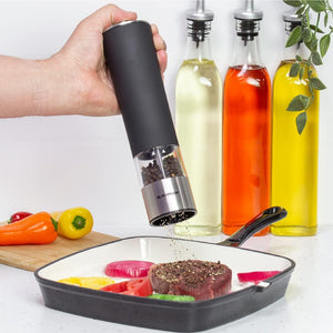 - BATTERY OPERATED – Each salt and pepper mill has been designed to look great on the worktops of both traditional and modern kitchens, and come in a stylish black colour with a stainless-steel body. Each mill is 23cm tall, battery operated, and requires 4 x AA batteries to work, (not included).