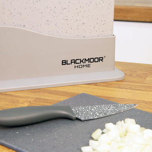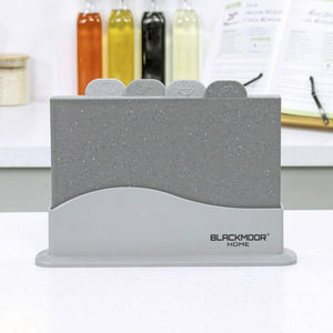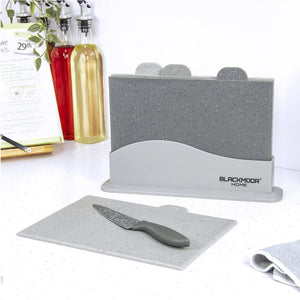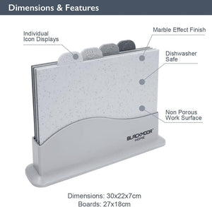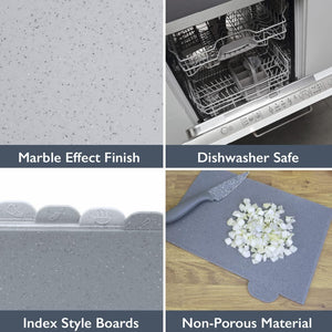 - STYLISH GREY MARBLE EFFECT – This stylish chopping board set utilises a grey marble effect finish, making them suitable for both modern and traditional kitchen settings. Each board is non-slip, and come complete with a stand to keep them organised and compact on your kitchen worktop surfaces.