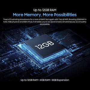 - Up to 12GB RAM, 128GB ROM with 1TB Expansion: Boasting 12GB RAM in total, 4GB physical and 8GB virtual, it enables you to do several tasks simultaneously as smoothly as possible. Tab 60 WiFi with 128GB ROM and up to 1TB expandable storage offers you enough space for your files, photos, episodes, and more. You don’t have to free up space constantly.
