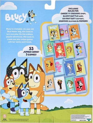 This pack contains 5 of your favorite card games all with a Bluey twist! Children will love playing SNAP with Bluey's Cheese "N" Crackers game or BATTLE with Bluey's Battle. The game of "Go Fish" is even more fun as "Go Fruit Bat!" Old Maid has never been funnier with Bluey's version called Grannies, and play an unforgettable game of Memory. These big sized jumbo sized cards are perfect for little hands to hold and play with! This fantastic set contains 53 cards!