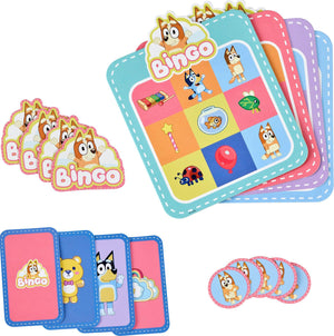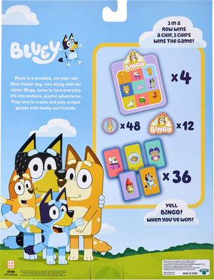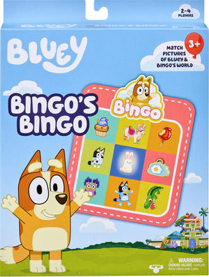 Bluey is a loveable, six-year-old Blue Heeler dog, who loves to turn everyday family life into endless, playful adventures. She loves to create and play unique games with her family and friends and now kids can too with Bingo's Bingo! Match pictures of Bluey and Bingo's world! Call out the images on the Calling Cards. When an images matches your Bingo Card place a Bingo Chip over it. The first player to get three Chips in a row on their card and yell BINGO wins the round and a Scoring Chip. Win three Scoring Chips and you win the game! Bingo's Bingo is an exciting and fun game for anyone aged three and up! For two to four players.