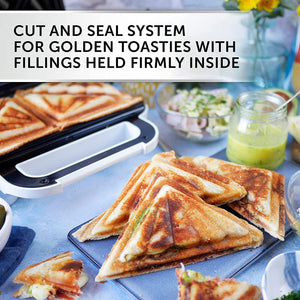 - Cut and seal system makes ideal, triangular toasted sandwiches; improved design browns toasties more evenly and helps prevent filling leakage
