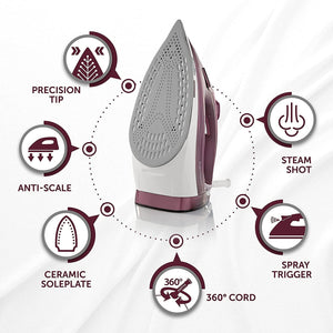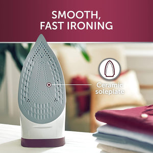 - Lightweight steam iron for easy holding, with a ceramic soleplate for smooth, fast ironing and a precision tip to navigate around buttons and tricky corners
