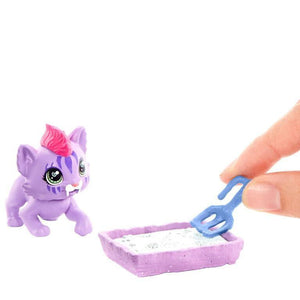 - Storytelling pieces include a pet cave, cat tower, "tablet" and litter box, plus treats and toys for her prehistoric pet friend!