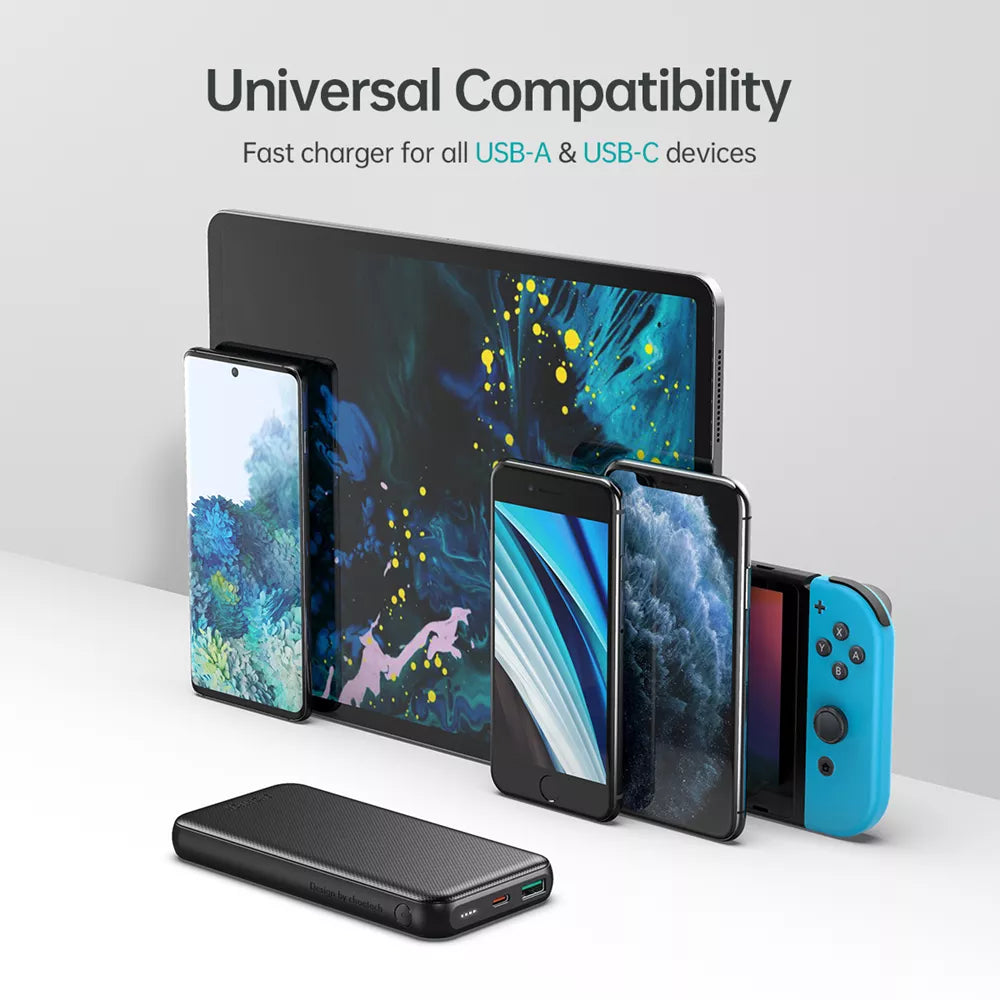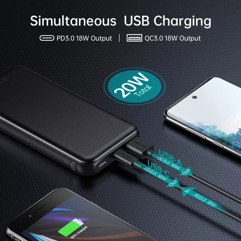 Both USB-C and USB-A port of the battery pack are equipped with the Qualcomm QC 3.0/2.0 technology that can full charge your Galaxy S10 in about 1.5 hours. It can also charge your headphones or eReaders. ☛Note: Powerbank provides a total power of 18W, when both ports are charging devices simultaneously, it returns to normal charging speed.