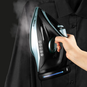 - Ready to use in as little as 25 seconds, this steam iron can be used corded or cordless and has a 360° charging base for easy storage.