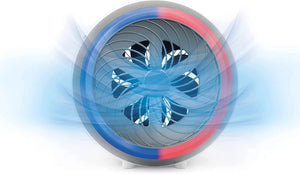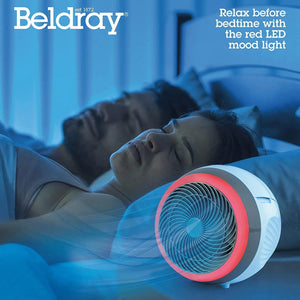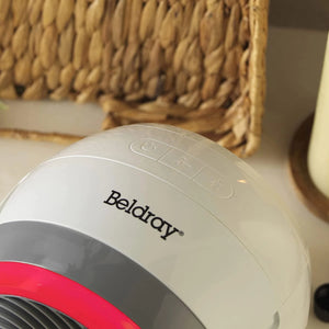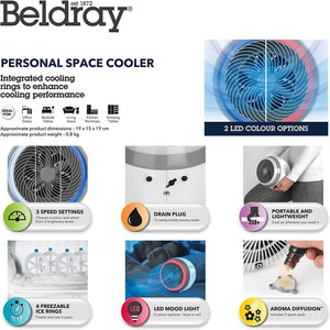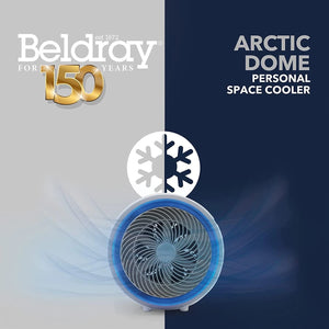 Measuring approx. 19 x 15 x 19 cm, the Beldray Arctic Dome personal space cooler is a compact way to achieve immediate cooling. With 4 freezable integrated ice rings for use in pairs, the Arctic Dome draws in warm air, pushes it through the unit, and releases cooled air out with a choice of 3 speeds. The 10 W device is supplied with a USB cable and adaptor for convenient power options, and also has red and blue LED mood lights, plus an aromatherapy box for use with essential oils (not included).
