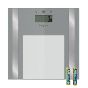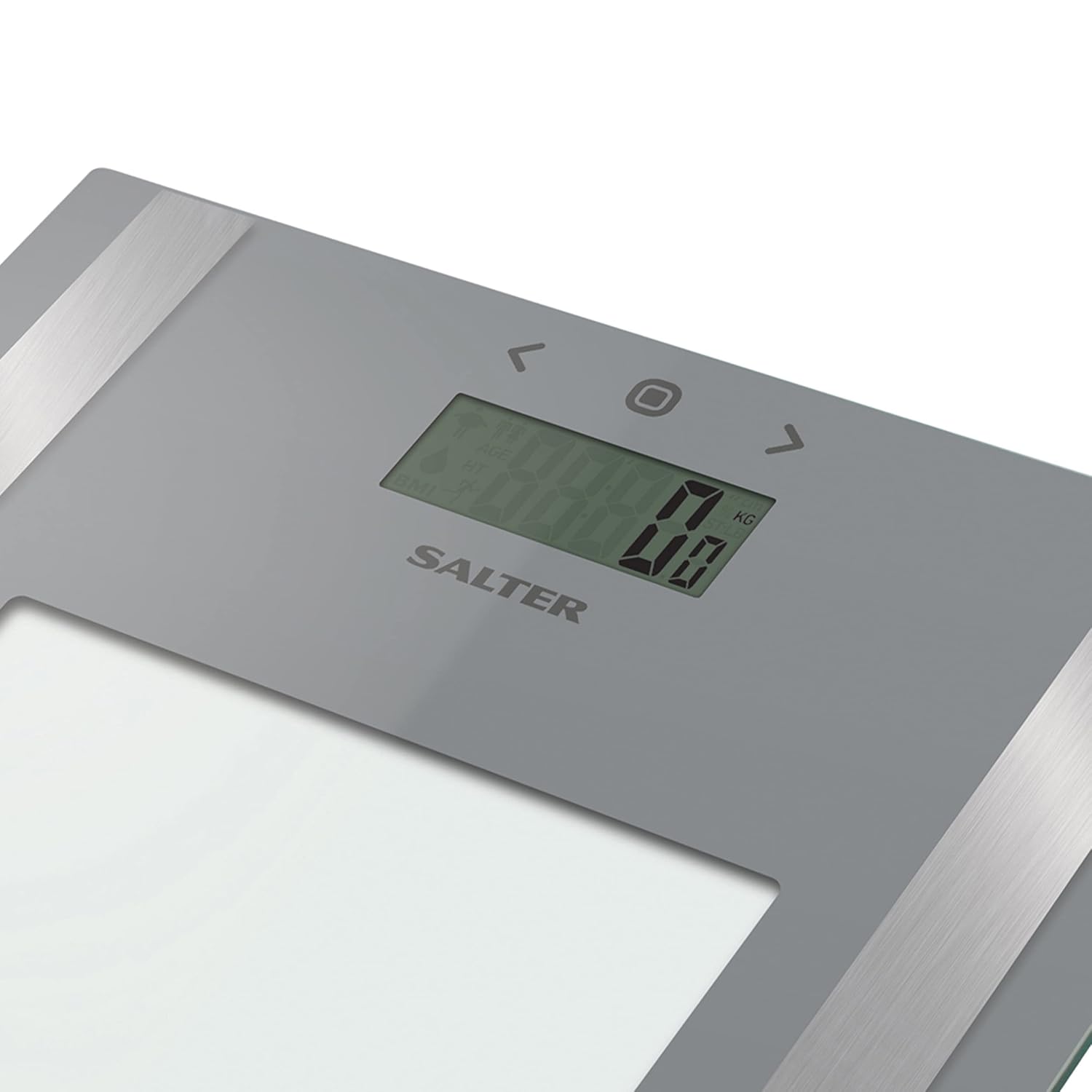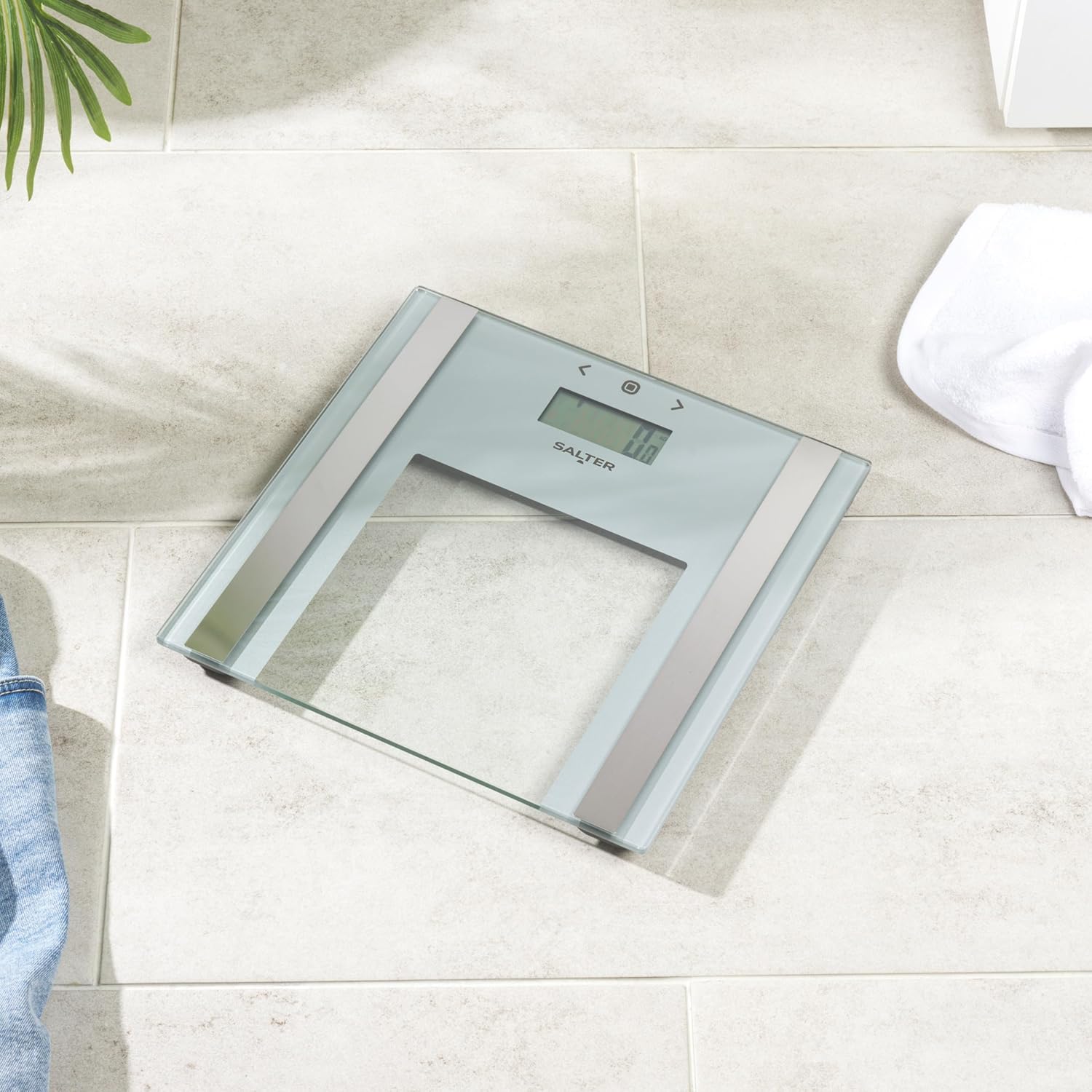 Salter Digital Glass Analyser Bathroom Scale – Bodyweight, Body Fat, Water & BMI Scale, 180kg/28st 3lb, LCD Easy To Read Display, 8 User Memory, Athlete Mode, Includes Carpet Feet