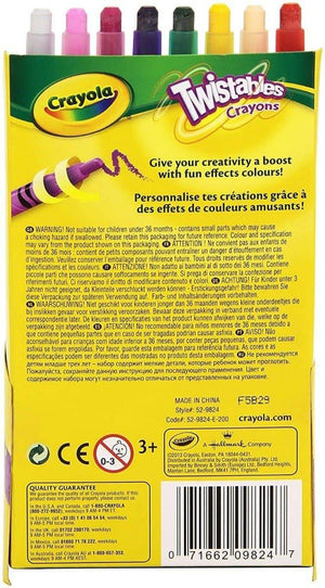 Crayola Mini Twistable Special Effects Crayons are wax sticks with an added twist! Simply twist the end of the barrel and you're ready to go. Add Neon, Rainbow or Regular colouring to your works of art! These are sure to set your imagination spinning. For ages 3 years and over.