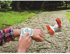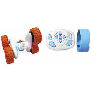An amazing stunt car with wrist remote control! Put the remote control on your wrist like a watch and let's go! 4 wheels moving 360 degrees to create insane moves! Adjustable wrist band for the control Programming function: the car demonstrates the moves you programmed! Amazing light effect on the car Charging time: around 40 mn. Play time: not less than 30 mn. Speed: 10-12 km/h Frequency: 2,4 Ghz Power Supply: Rechargeable battery (for the car) + 2 x LR03/AAA batteries of 1.5V (not included). Warranty: 2 years. Designed and developed in Europe - Made in China.