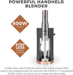 - Powerful handheld blender - get the same great blending functions in less space than a traditional blender. Perfect for smaller kitchens! Unlike other hand held blenders with cheap motors that need to be stopped every 30 seconds, The Crux 6 in 1’s powerful 800W motor can stand up to longer blending tasks
