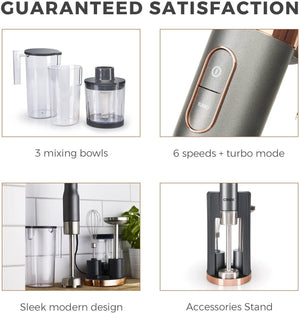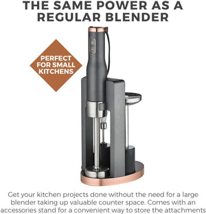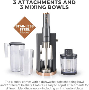 - 3 attachments and 3 mixing bowls - the most versatile hand mixer yet with multiple accessories for different tasks. Whisk, mash, chop and blend - all with a device that fits comfortably in your hand. The blender comes with a dishwasher safe chopping bowl and 2 different beakers. Make anything from soups and smoothies, to chopped vegetables or even for whipping cream or egg whites. Each blender comes with an accessory Stand for easy storage