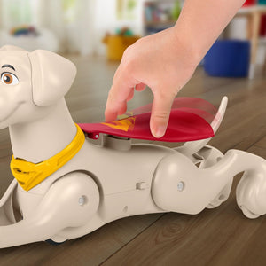 - Press his cape to "rev" up Krypto the Superdog for motorized action. The more kids press, the farther he'll go!