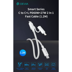 Stay charged with speed and style with the Devia 1.2m (60W & 27W) USB-C to Lightning & USB-C Cable. Experience the convenience and efficiency of fast charging and data transfer, all in one versatile and durable cable.