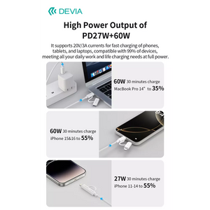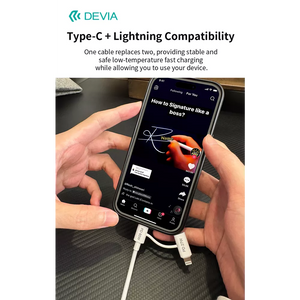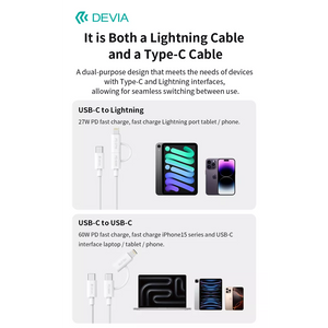 The Devia cable supports a current of 3A for both the 60W USB-C to USB-C connection and the 27W USB-C to Lightning connection. This ensures fast and efficient charging for, including smartphones, tablets, and laptops. Additionally, this versatile 2-in-1 cable is designed for both charging and data transfer, making it an essential accessory for your digital life. Whether you need to power up your devices or transfer files quickly, the Devia cable has you covered.