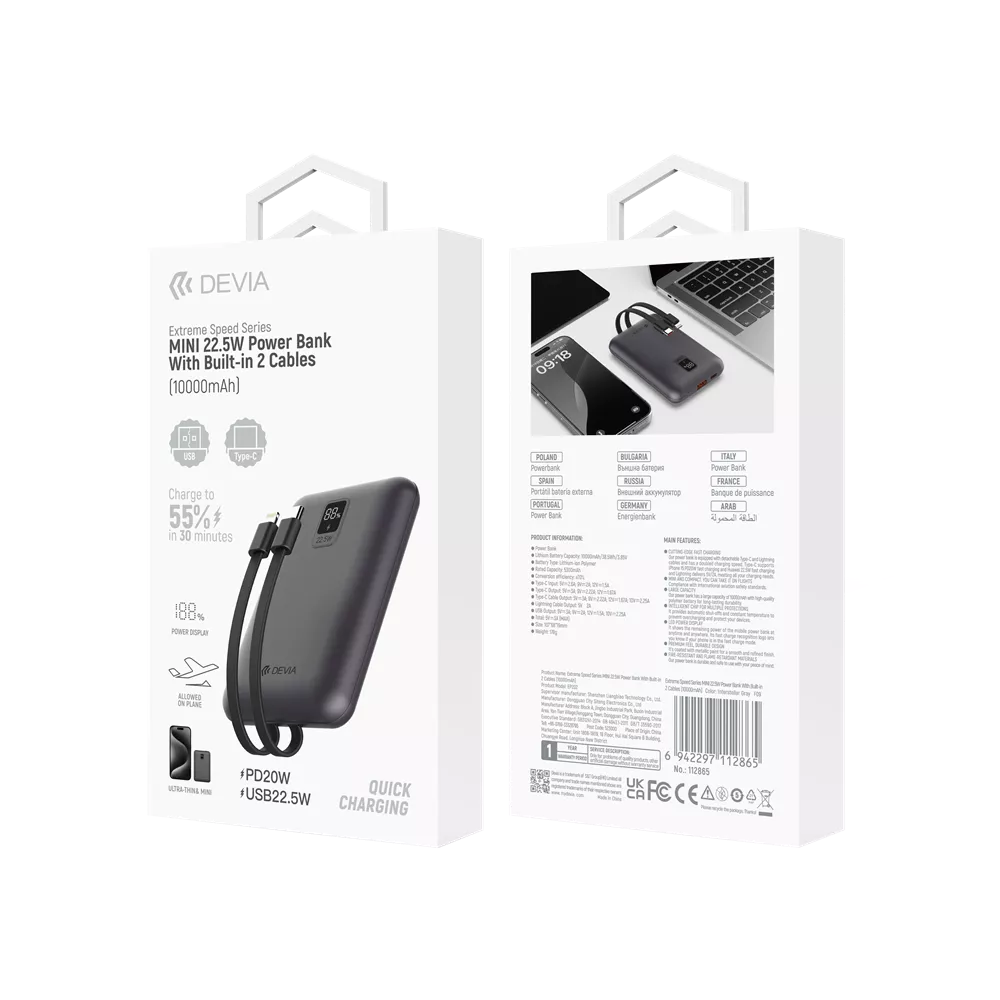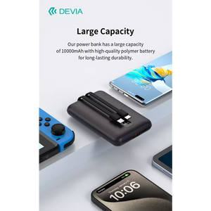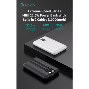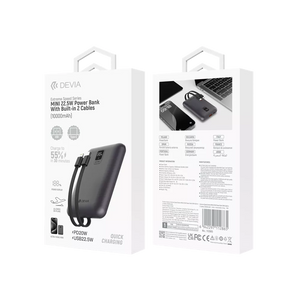 Elevate your charging experience with the Devia 10,000mAh PD Mini Powerbank. Enjoy the convenience of built-in cables, fast and efficient charging, and the peace of mind that comes with certified safety features. Keep your devices powered and ready for whatever the day brings with this versatile and reliable Powerbank.
