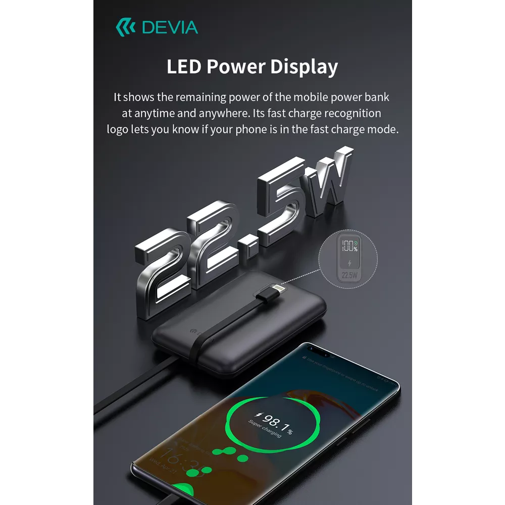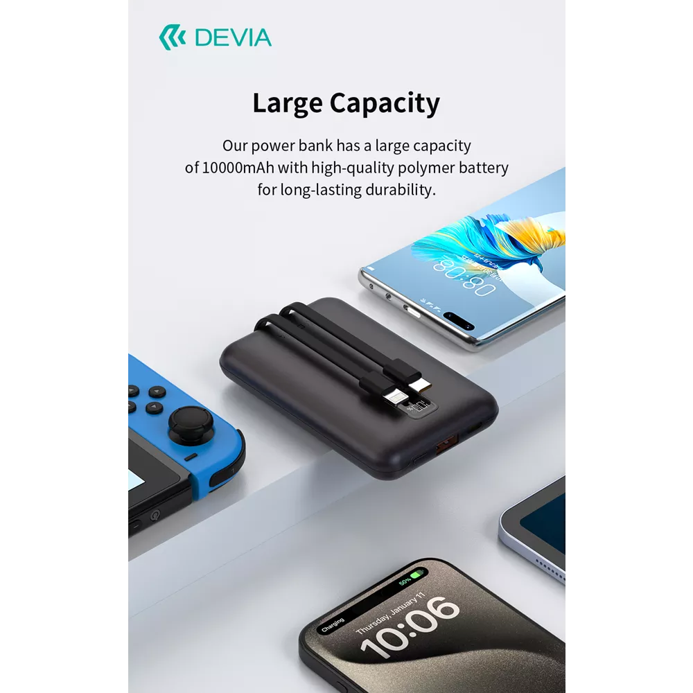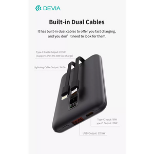 The Devia Powerbank features built-in Lightning and USB-C cables, providing you with the flexibility to charge a wide range of devices. No more hunting for the right cable—it's all built-in and ready to go.