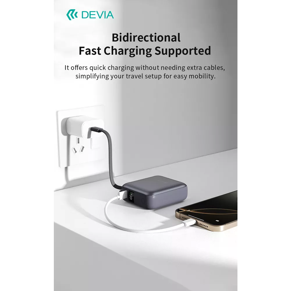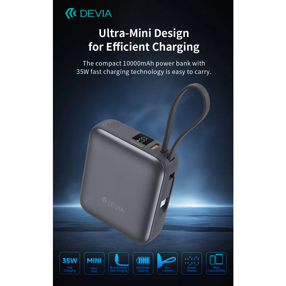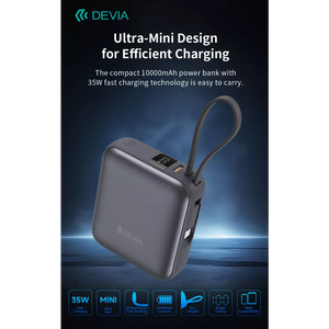 Elevate your mobile charging experience with the Devia 10,000mAh 35W PD Powerbank. Power up smarter, faster, and safer wherever life takes you. Discover a power solution engineered for speed, intelligence, and portability. The Devia 10,000mAh 35W PD Powerbank combines robust battery capacity with cutting-edge digital monitoring, all wrapped in a sleek grey chassis.
