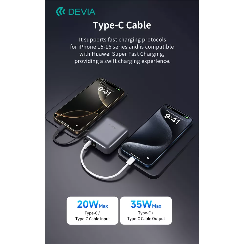 Engineered around a versatile Type-C port and integrated cable, Devia offers bi-directional charging at up to 20W input and 35W output. The input accepts 5V–3A, 9V–2.22A, or 12V–1.67A to refill quickly, while the output spans from 5V–3A up to 15V–2.33A. Whether you’re powering a laptop, smartphone, or tablet, the Powerbank automatically adjusts its voltage and current for maximum efficiency and safety.