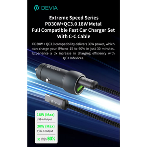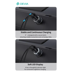 The Devia car adapter guarantees a charge from 0-50% within 30 minutes, thanks to its powerful charging ports. The Power Delivery USB-C port, when used with a Type C to Lightning Cable, allows your Apple device to charge from 0-50% in just 30 minutes. Similarly, the Qualcomm USB port, used with a USB to Type C Cable, ensures that your Android device achieves the same rapid charging efficiency.