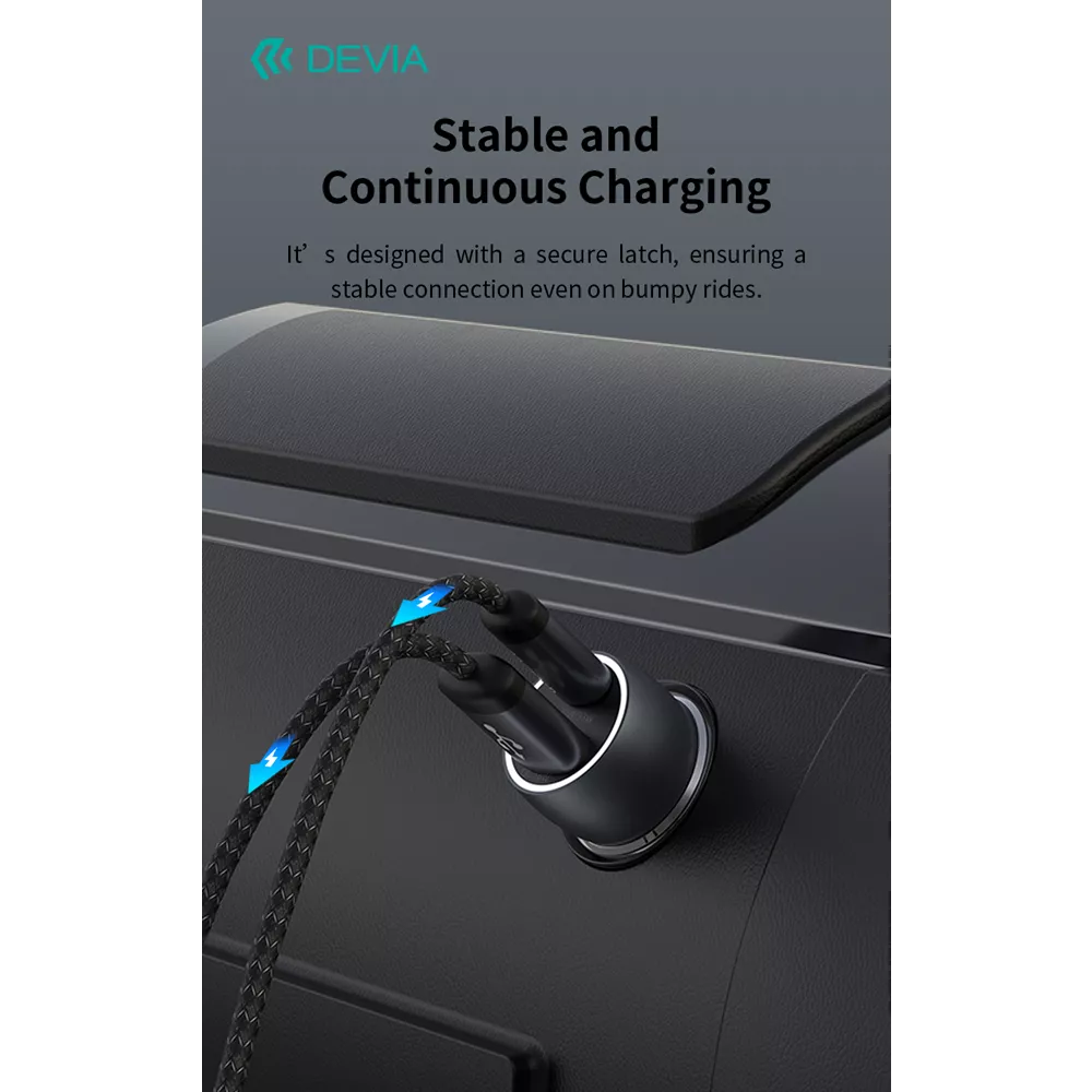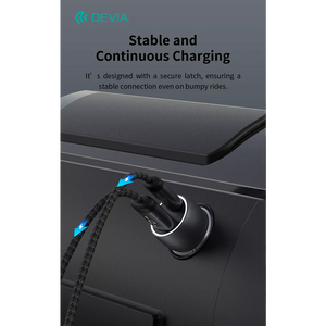 The Devia car adapter guarantees a charge from 0-50% within 30 minutes, thanks to its powerful charging ports. The Power Delivery USB-C port, when used with a Type C to Lightning Cable, allows your Apple device to charge from 0-50% in just 30 minutes. Similarly, the Qualcomm USB port, used with a USB to Type C Cable, ensures that your Android device achieves the same rapid charging efficiency.