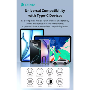 The Devia adapter provides a flawless transition from Type-C to a standard 3.5mm audio interface. Designed for precision, it ensures every note of your favourite tracks and every word of your calls is delivered with uncompromising clarity. Whether it enhances your experience on mobile phones, car audio systems, or Bluetooth speakers, it consistently performs to meet your high expectations.