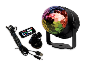 The disco light includes a suction cup mount, 4m long USB power cable and instruction manual.