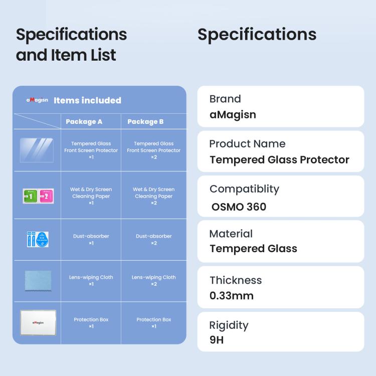 Enhance the durability and clarity of your DJI Osmo 360 Camera with the AMagisn HD Tempered Glass Screen Protector. This pack includes two sets of high-quality screen protectors designed to offer superior protection against scratches, smudges, and impacts. Each protector is precisely cut to fit your camera's screen, ensuring seamless functionality without compromising the touch sensitivity.