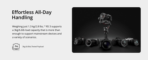 - 3 kg (6.6 lbs) Tested Payload - With a weight of just 1.3 kg (includes gimbal, battery handle, and double-layer quick release plates), DJI RS 3 offers a max tested payload of 3 kg (6.6 lbs).
